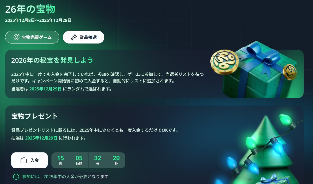 - 1万円以上のご入金で自動エントリー。4段階の設定があり高額な入金ほどボーナスも高額となります。