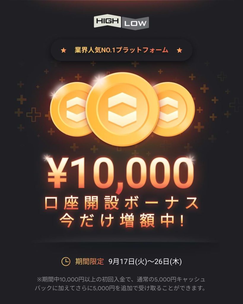 ハイロードットコム(ハイローオーストラリア)で、初回入金ボーナスが倍額の1万円になるキャンペーンが開催されまる!